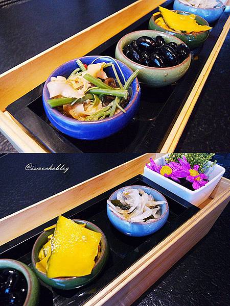 醋拌洋蔥絲、百香南瓜片、甜漬黑豆、涼拌干貝唇