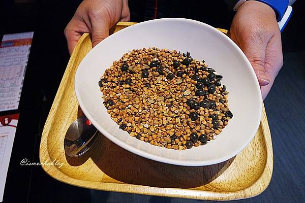 入座後今天為我們服務的主任端來一盤新鮮小麥粒,舀一匙放進杯中再沖入熱茶水,瞬間麥香撲鼻而來