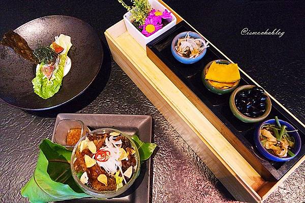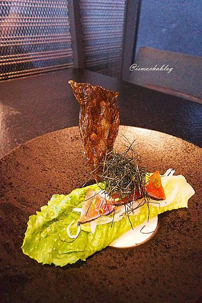 用美生菜包著炙燒鰹魚,搭配和風醬汁,盤底是優格洋芋,再用烤昆布插旗