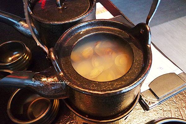 是土瓶蒸的概念,將蒜頭、花蓮蜆,搭配日式昆布柴魚高湯,是集精華於一身的湯品啊