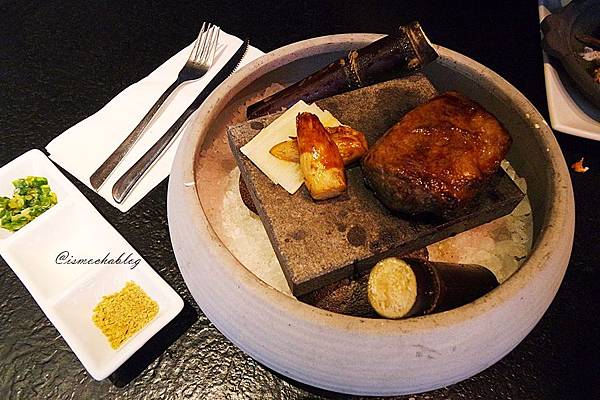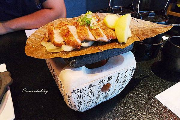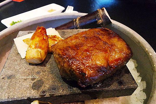 用火烤的方式料理,竹葉下墊著溫熱石一同上桌