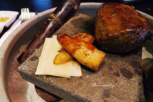 一旁的配菜是杏鮑菇和甘蔗片,炙燒過的甘蔗片好像在吃糖一樣