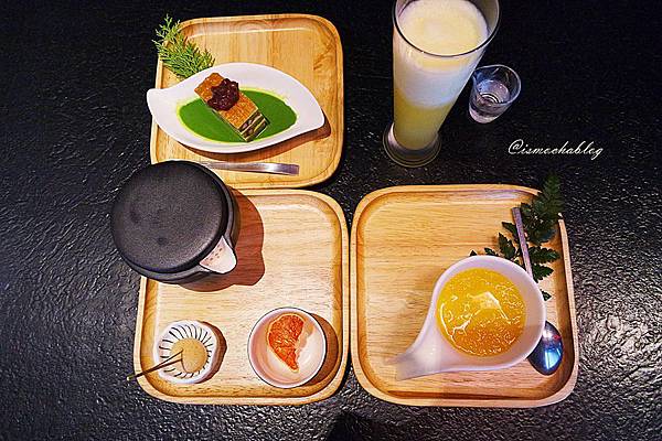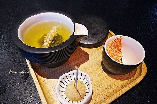 主廚烘焙的柚子片搭配綠茶包,這款茶飲帶著苦味,不過也伴隨著柚子香氣