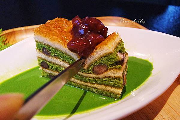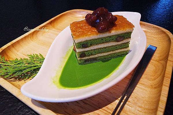 淋上濃稠抹茶醬的日式千層蛋糕,蛋糕本身是略顯紮實有彈性的鬆糕口感,甜而不膩口